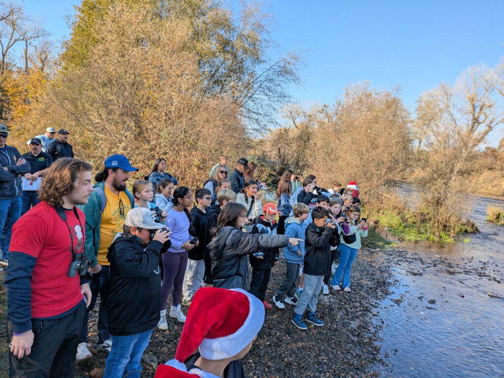 Linden High School students lead a field trip for 5th grade students from Dent Elementary School of Escalon Unified School District in December 2025. They are looking at the water near the Mokelumne River Fish Hatchery in Clements. Image: San Joaquin County Office of Education