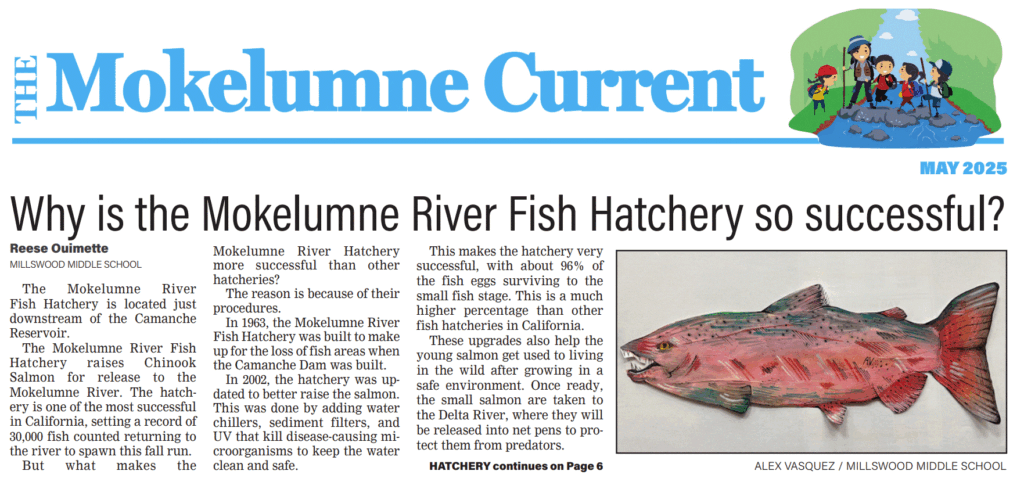One of Grant’s projects is The Mokelumne Current, an online and print newspaper that comes out every May. The paper contains stories, illustrations, puzzles, and games about Chinook salmon and other native species in the Mokelumne River. EBMUD funds many of the field trips that inspire the content which students create.
