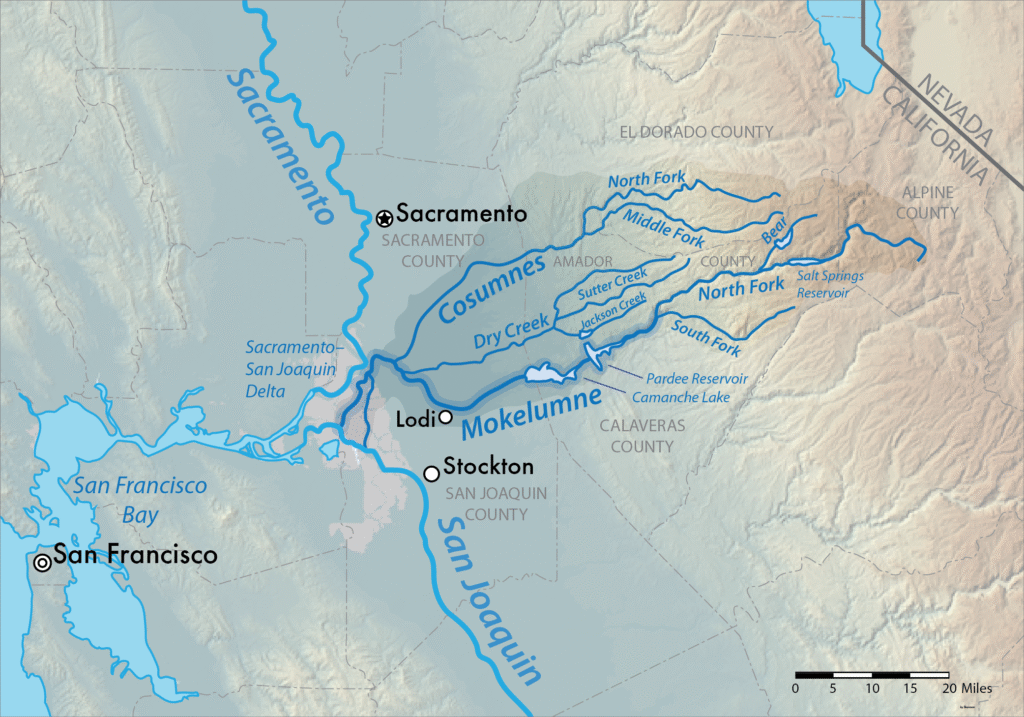 The Mokelumne watershed is centered around the Mokelumne River. This 95-mile-long river flows west from headwaters high on the western slope of the Sierra Nevada mountains. The Mokelumne River ultimately empties into the San Joaquin River. There are 16 water impoundments along the Mokelumne River. These are areas where water is collected in an artificial reservoir behind a dam.
