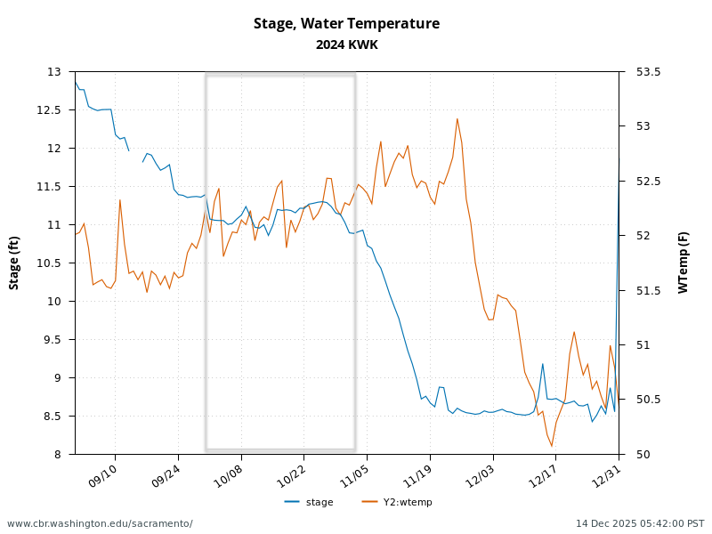 Figure 2. Stage and water temperature in the Sacramento River below Keswick Dam in fall 2024. Grey box denotes period when most fall run salmon spawn in the upper Sacramento River.