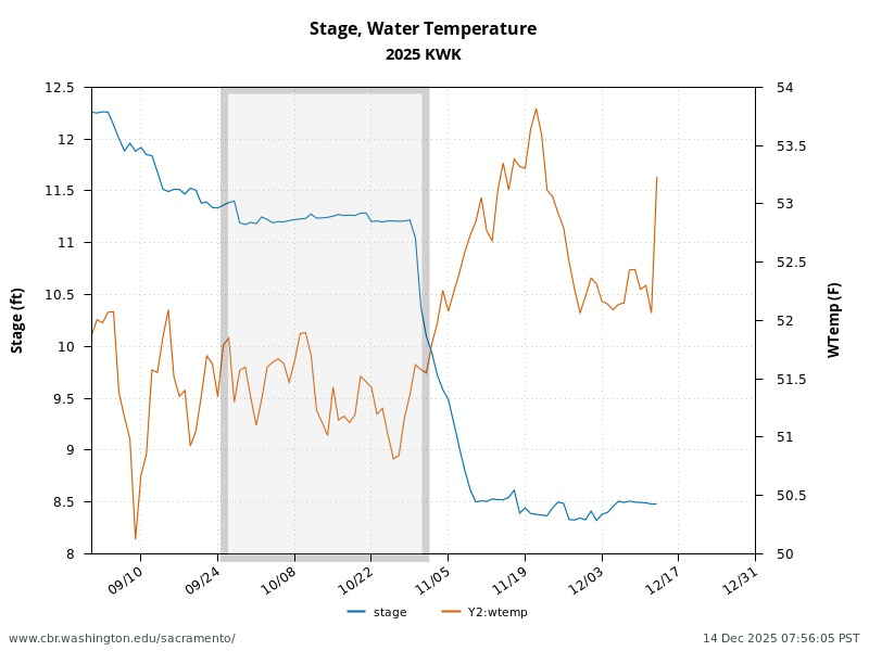 Figure 3. Stage and water temperature in the Sacramento River below Keswick Dam in fall 2025. Grey box denotes period when most fall run salmon spawn in the upper Sacramento River.