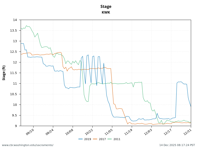 Figure 4. Stage and water temperature in the Sacramento River below Keswick Dam in fall of wet years 2011, 2017, and 2019.