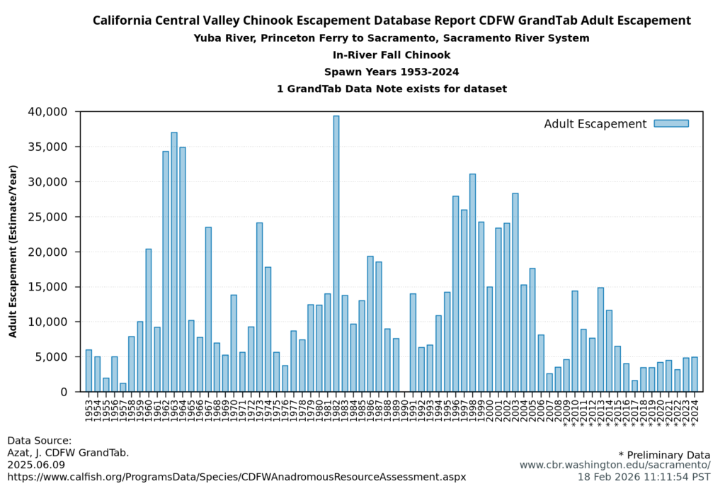 - The preliminary 2025 estimate is near 6000, https://yubariver.org/posts/yuba-river-salmon-return-numbers-september-december-2025/ ↩