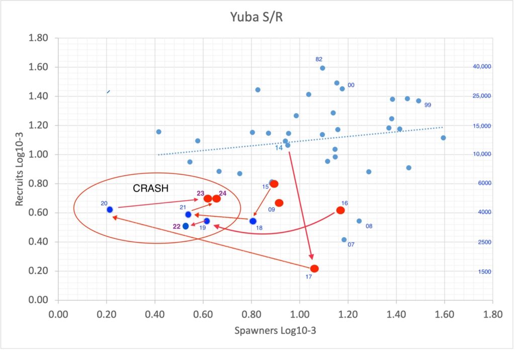I categorize the decade-long decline as a “crash” based on the population spawner-recruit (S/R) relationship (Figure 2). The S/R “curve” generally reflects a positive logarithmic relationship between spawner and recruitment numbers. The more eggs spawned generally leads to more adult returns three years later. The S/R ratio, at least in the Central Valley salmon populations, also reflects drought or habitat conditions wherein recruits are generally depressed from density-independent habitat factors like droughts. The six drought years in the last decade shown in Figure 2 as red dots have led to escapement levels in the lower-left quadrant of the S/R curve – a pattern often referred to as a population crash.