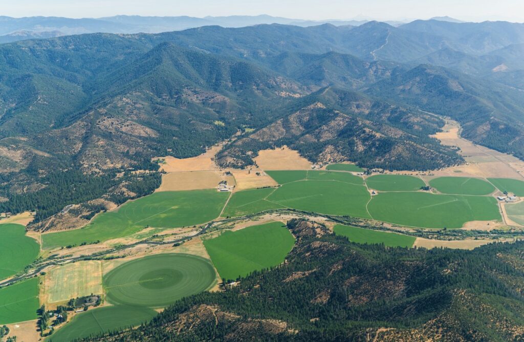 Aerial view of irrigated acreage adjacent to the Scott River, captured on an EcoFlight tour. Image: Ecoflight