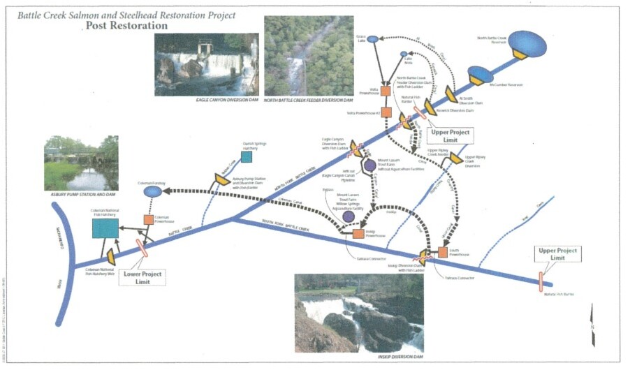 Battle Creek Salmon & Steelhead Restoration Phase 2. This map depicts a nearly free-flowing South Fork after completion of Phase 2 projects. Image: Battle Creek Restoration Program