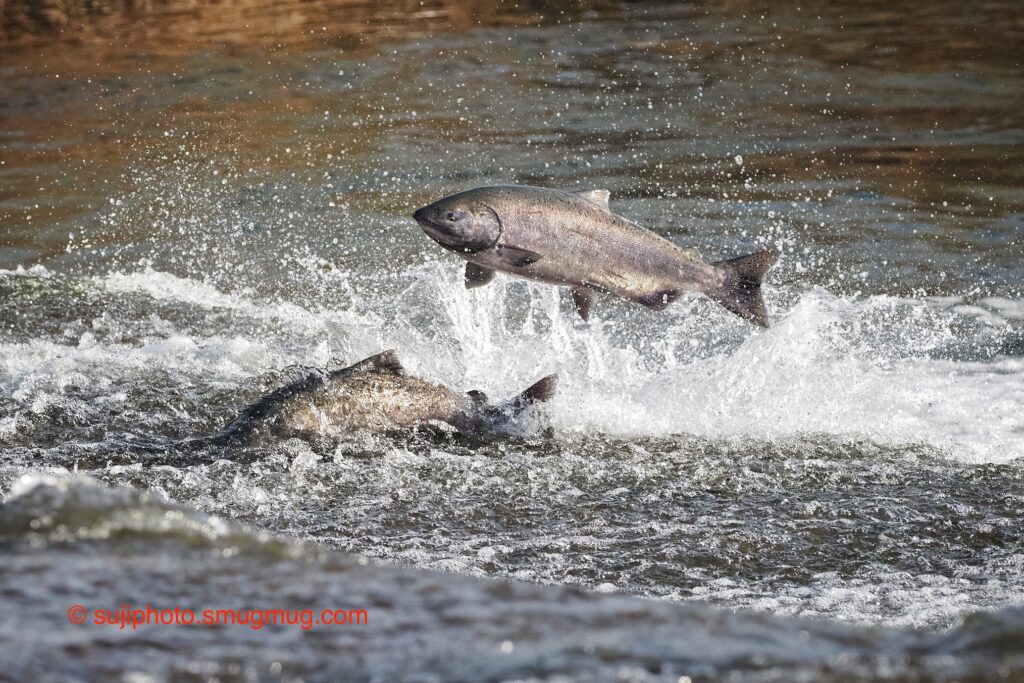 Two Chinook salmon jumping near the PPDD in Butte Creek. Image: Suji Adrian Roland