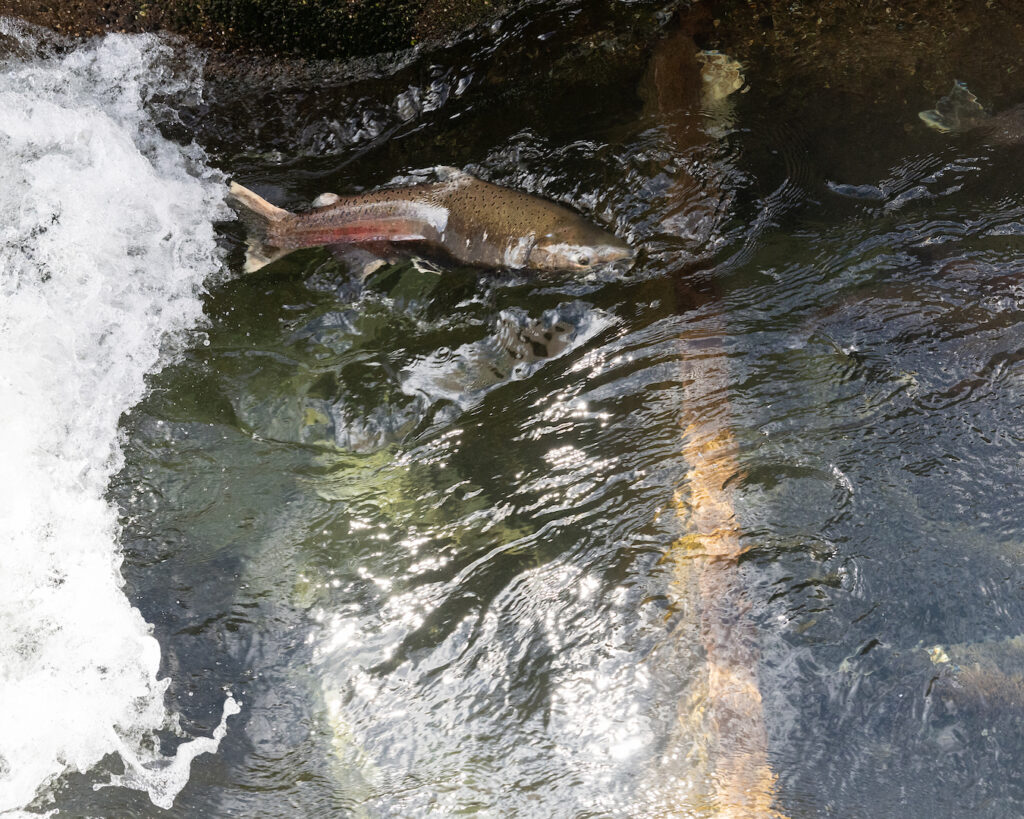 “The fish ladder has about six weirs in it. There are “wing walls” on either side and “windows” at the bottom. That way the fish don’t have to go over the weirs. Once they find the windows, they just shoot through,” said Harthorn. The ladder functions well because it provides several opportunities for fish to travel up.