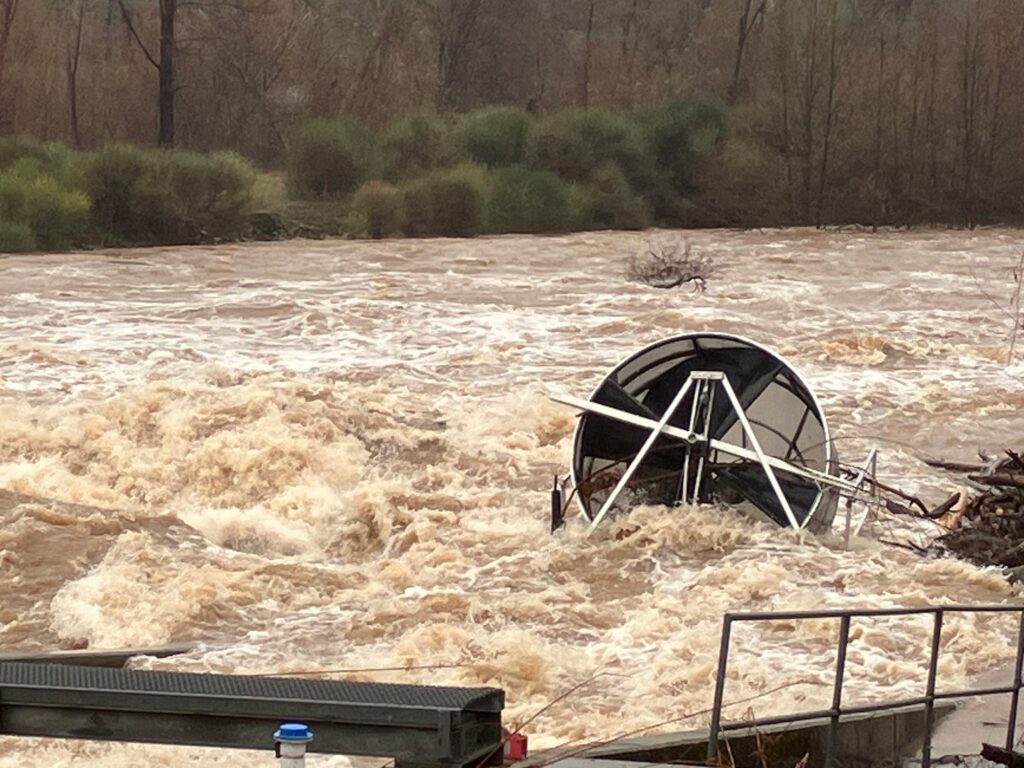 The rotary screw trap at the Parrott-Phelan Diversion Dam during high flows. Image: Allen Harthorn