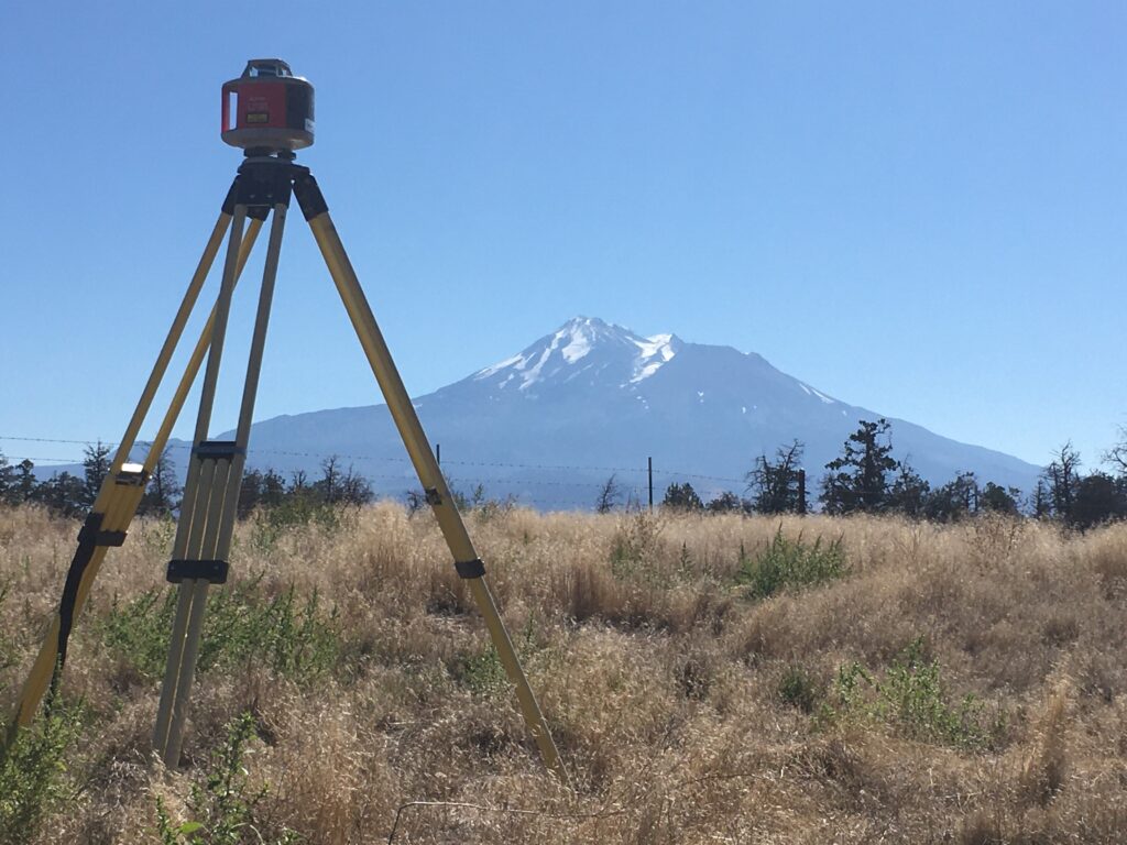 Mount Shasta, seen from a survey tool used to measure the flow elevation of Big Springs Creek in September 2025. Image: Angelina Cook