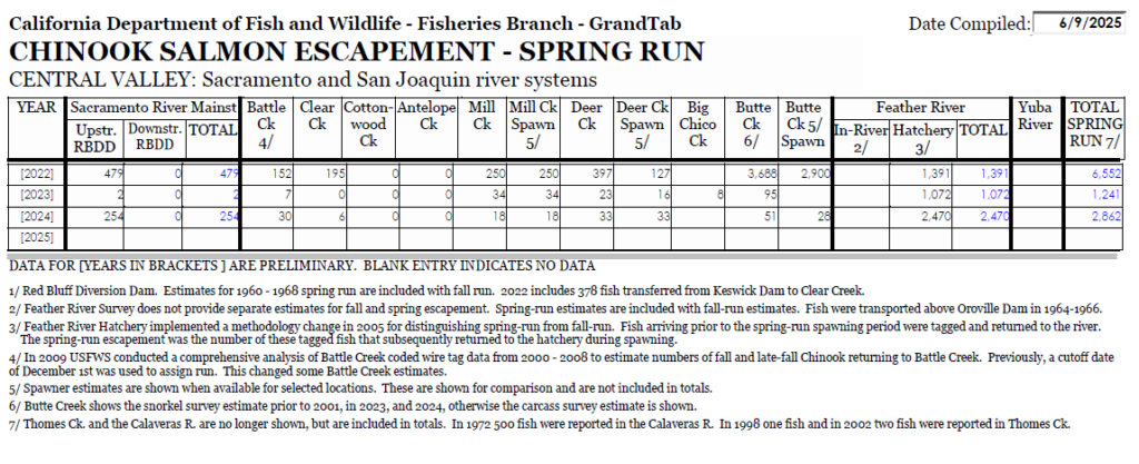 A segment of the California Central Valley Escapement chart from June 9, 2025. Image: California Department of Fish and Wildlife
