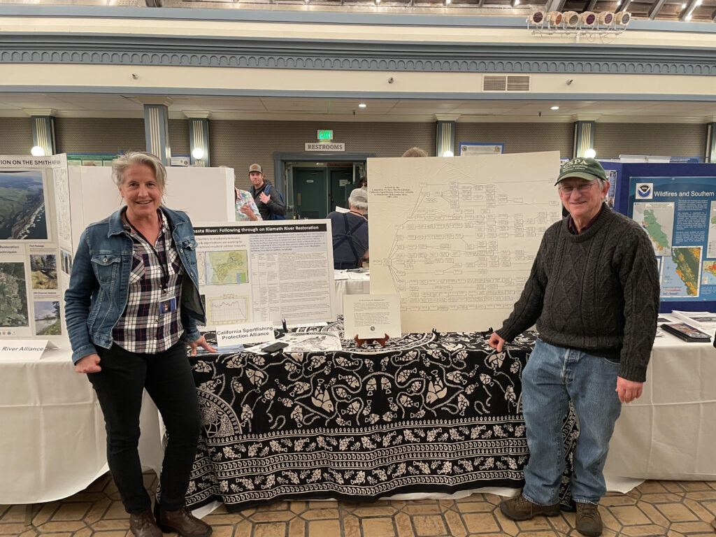 Angelina Cook, Restoration Associate for CSPA (left) and Chris Shutes, Executive Director of CSPA (right), display CSPA posters at the 2025 Salmon Restoration Federation conference in Santa Cruz. Image: Angelina Cook